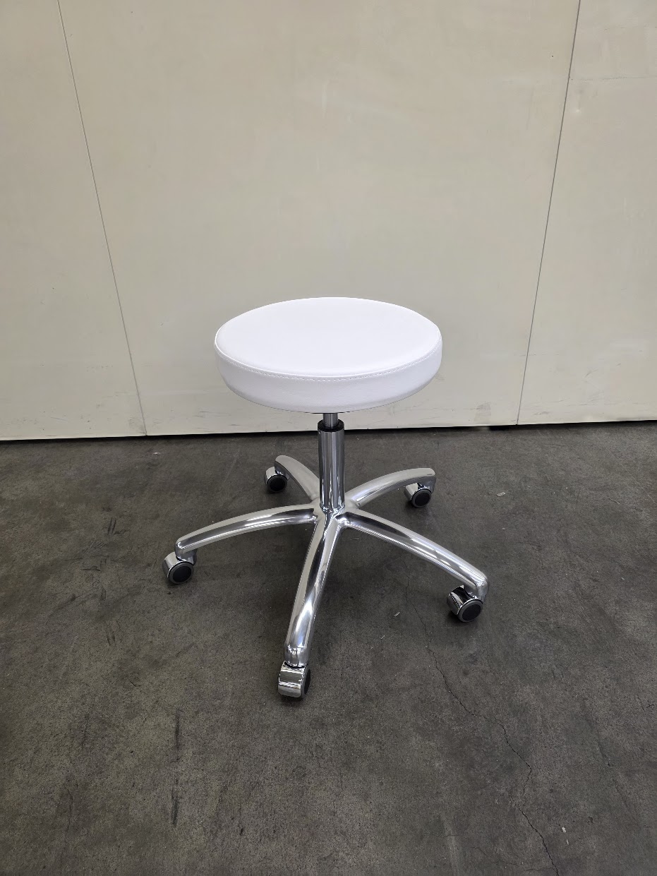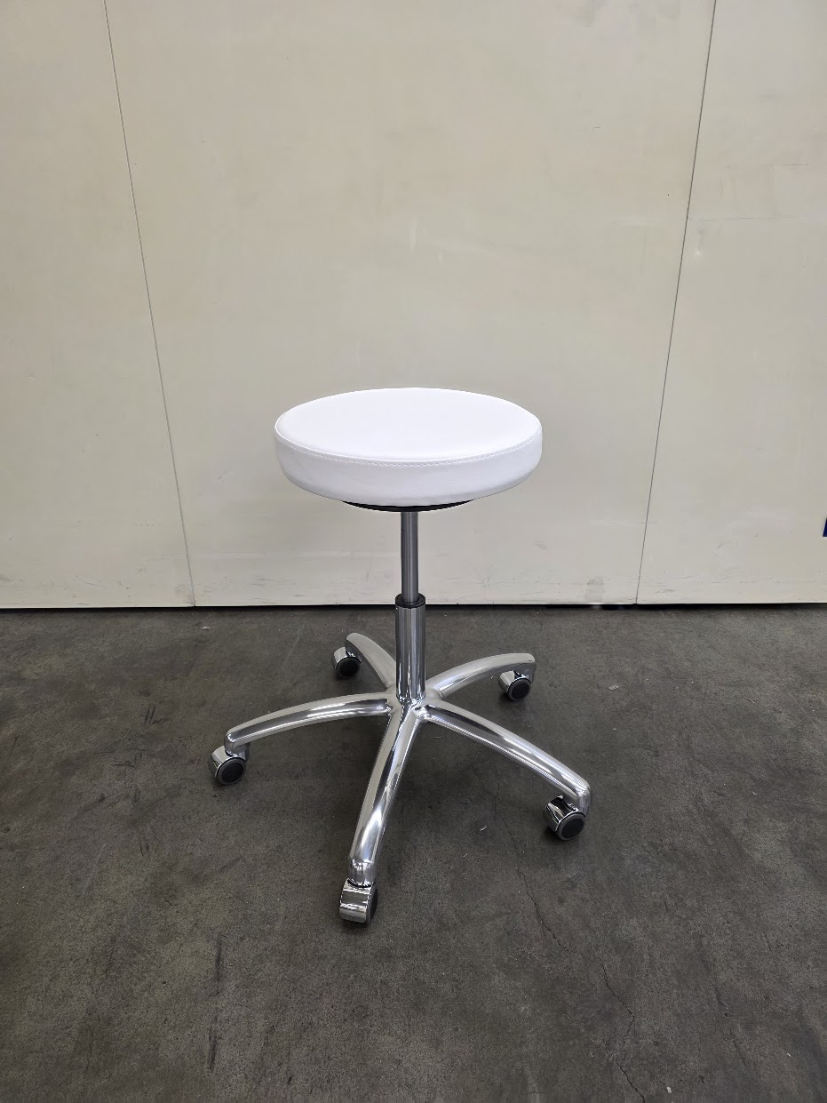 pneumatische hoogteverstelling, 50-62 cm // draaibare ronde zitting // veiligheidsvoet met 5 wielen // rubberen wielen met rolstopfunctie // comfortabele bekleding // afwasbare en slijtvaste hoes // kunstlederen bekleding in wit.