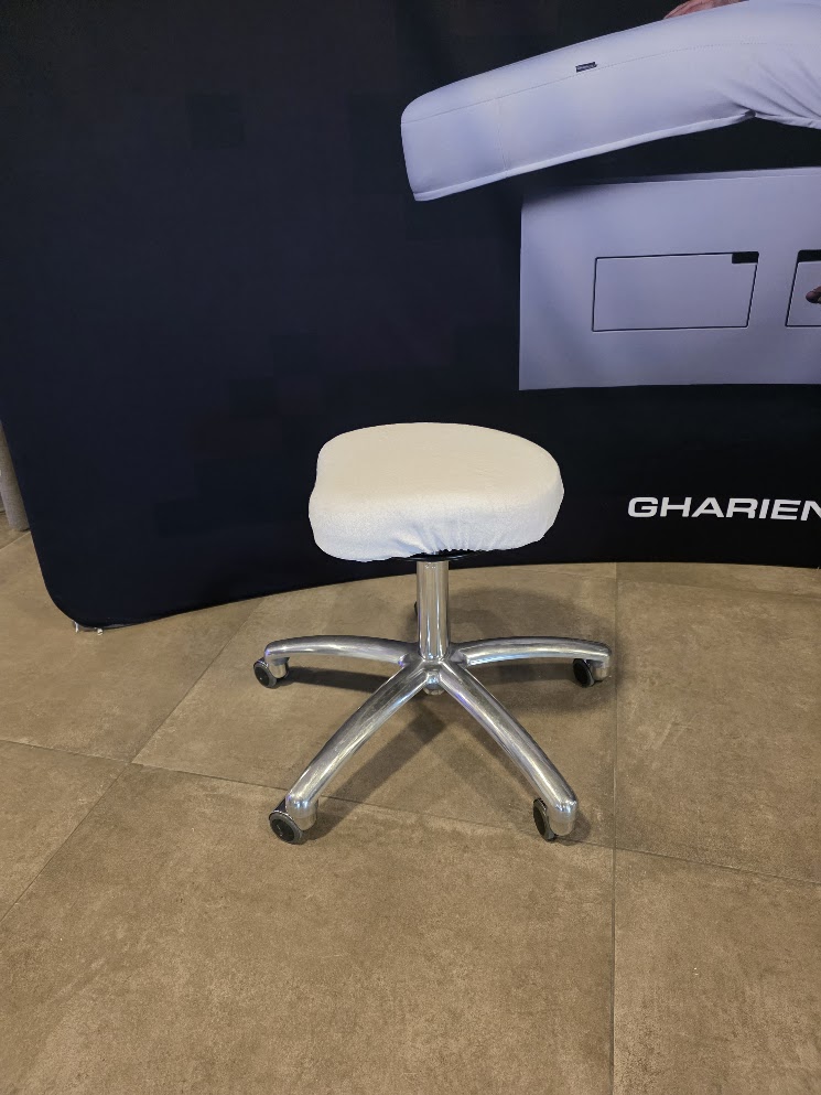 pneumatische hoogteverstelling, 50-62 cm // draaibare zadelzitting // veiligheidsvoet met 5 wielen // rubberen wielen met rolstop // comfortabele bekleding // afwasbare en slijtvaste hoes