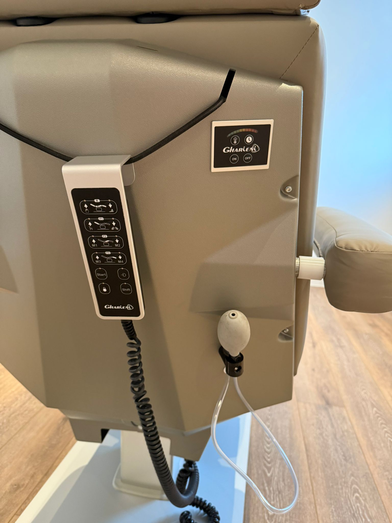 - Hoogte, rugleuning, zithelling en beensteun elektrisch verstelbaar