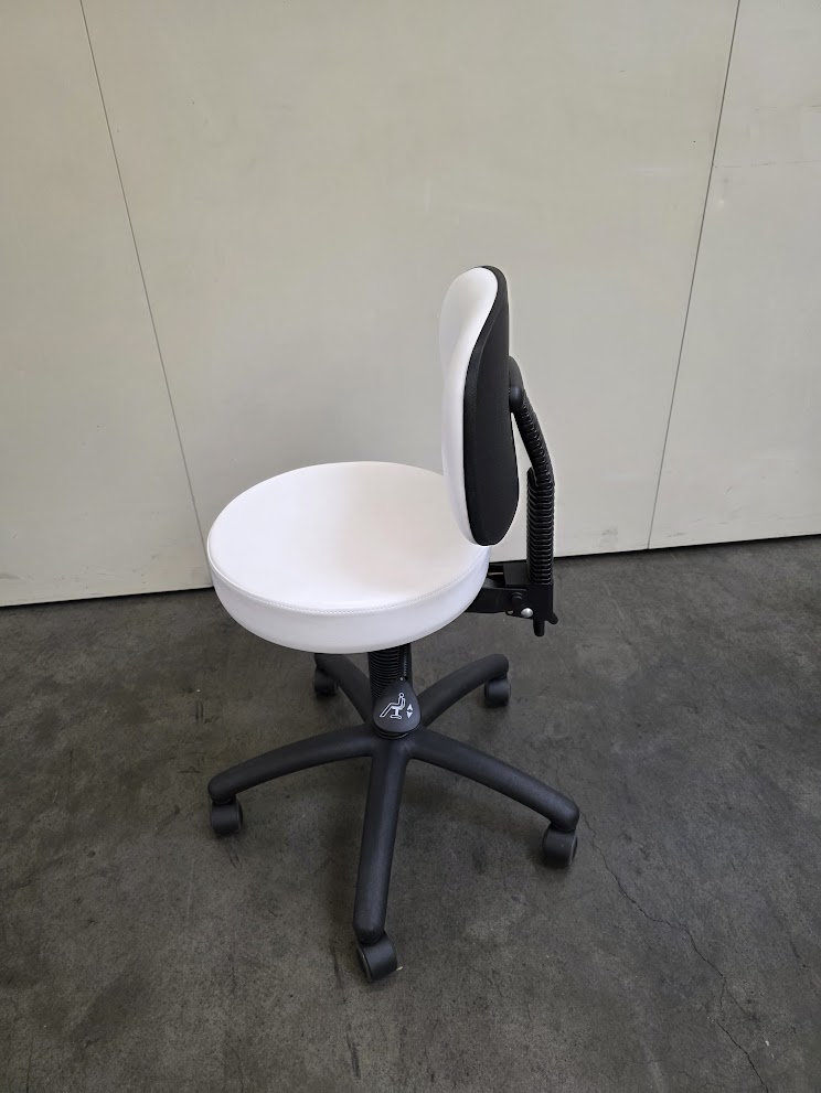 pneumatische hoogteverstelling, 50-62 cm // draaibare ronde zitting // 5-wielige veiligheidsvoet // rubberen wielen met rolstopfunctie // comfortabele bekleding // afwasbare en slijtvaste bekleding // kunstleren bekleding in wit