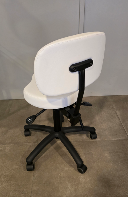 pneumatische hoogteverstelling, 50-62 cm // draaibare ronde zitting // 5-wielige veiligheidsvoet // rubberen wielen met rolstopfunctie // comfortabele bekleding // afwasbare en slijtvaste bekleding // kunstleren bekleding in wit