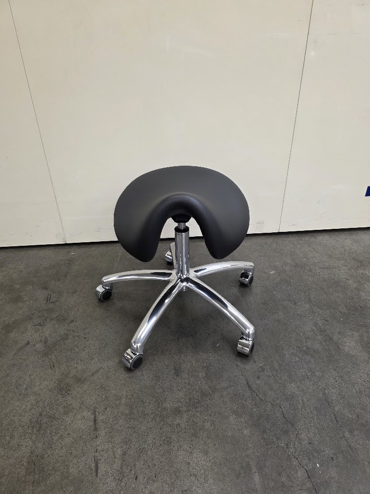 met extra brede zitting // pneumatische hoogteverstelling, 59-80 cm // draaibare zadelzitting // veiligheidsvoet met 5 wielen // rubberen wielen met rolstopfunctie // comfortabele bekleding // afwasbare en slijtvaste bekleding // kunstlederen bekleding in zwart